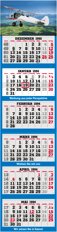 La familia de calendarios en Terminic está creciendo de nuevo: Con una altura de poco menos de un metro, un peso de unos 350 gramos y sus 4 tiras publicitarias, el calendario de 5 meses Super 1 HiFive ahorra tanto espacio como un calendario de 4 meses. Gracias al bloque de calendario inferior de dos partes, los clientes tienen a la vista 3 meses consecutivos. Además del mes anterior y el actual, el nuevo calendario publicitario ofrece una visión general ideal de 5 meses.