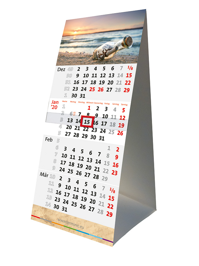 Con el Planificador de mesa «Quadro» agrandamos la gama de nuestros calendarios promocionales. Este calendario de mesa tiene un amplio resumen de 4 meses y es por eso muy practico. Además, viene con un gran espacio publicitario en la parte superior e inferior, como también en la parte trasera. El calendario de mesa «Quadro» se produce en la misma alta calidad, como los demás calendarios de terminic.